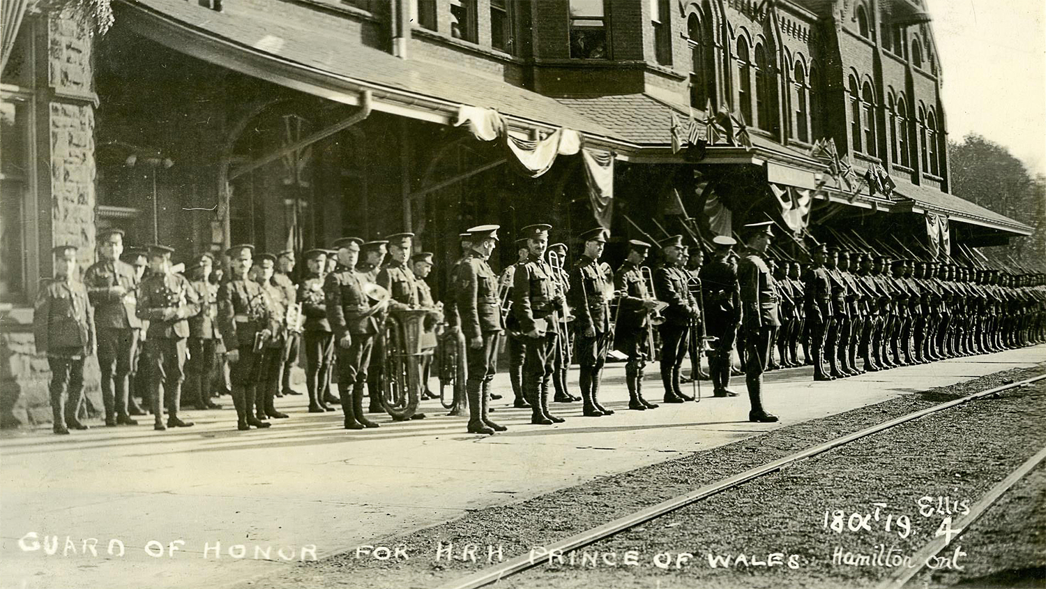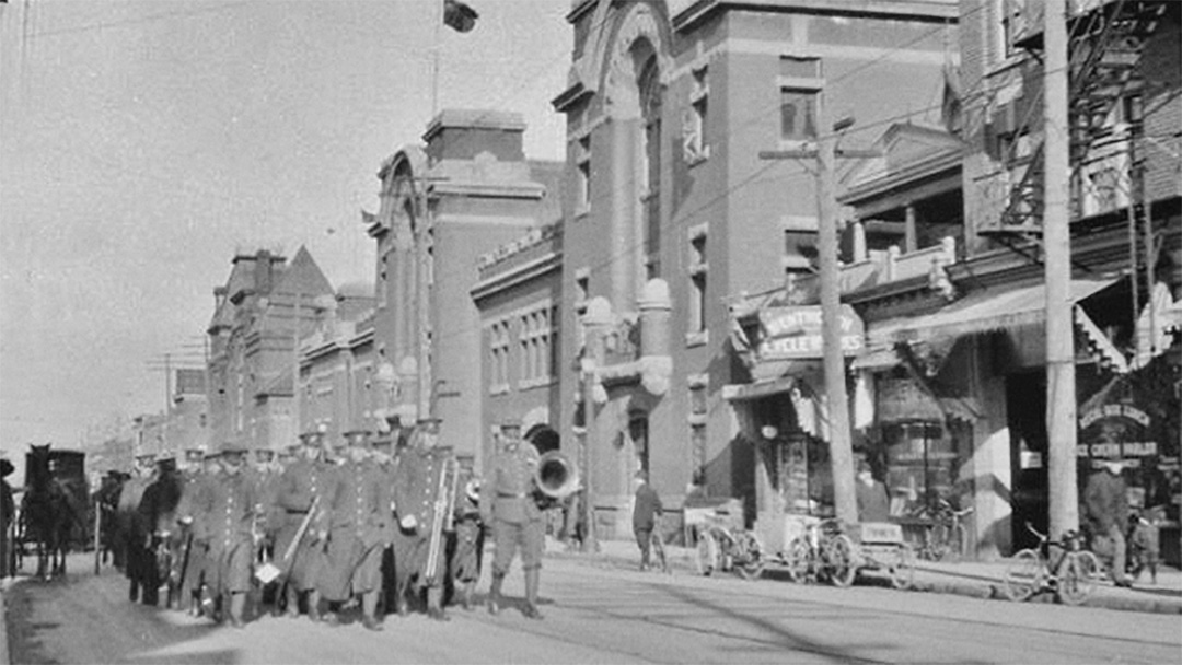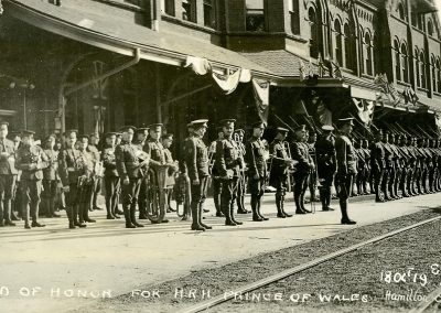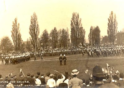 The Royal Hamilton Light Infantry perpetuates five Canadian Expeditionary Force (CEF) Battalions from World War I: the 4th, 86th, 120th (City of Hamilton), 129th and 205th. The Regiment has this distinction because it recruited and contributed so many men to these battalions. The Militia lists of the Great War report that all these battalions had bands and three also had bugle bands. This pictures shows the 86th Bn CEF marching down James Street.