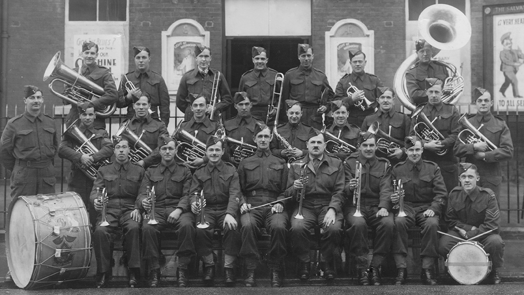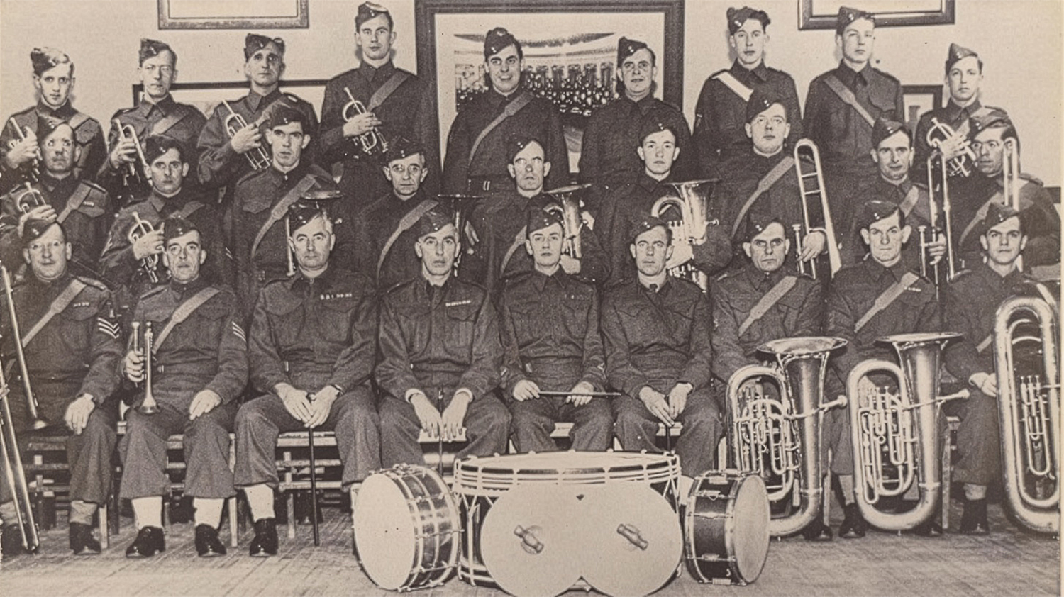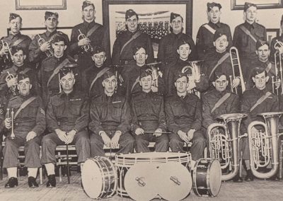 The 1 Bn RHLI Band accompanied the Regiment to England in July 1940 and was returned to Canada in 1942. This Band was directed by Sgt Thomas Sharman until 1941 when the bandsmen returned to Canada formed the nucleus of the No 2 Depot Band in Toronto. This picture taken in 1941 in England, shows Padre Capt John Foote VC (front row fourth from right) who played trumpet in the band.